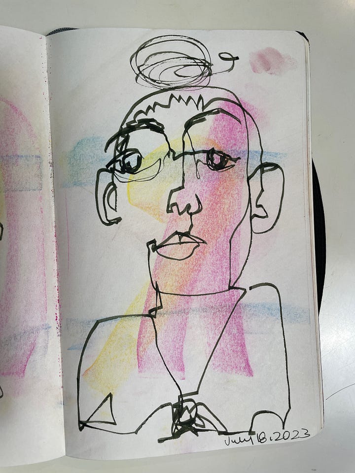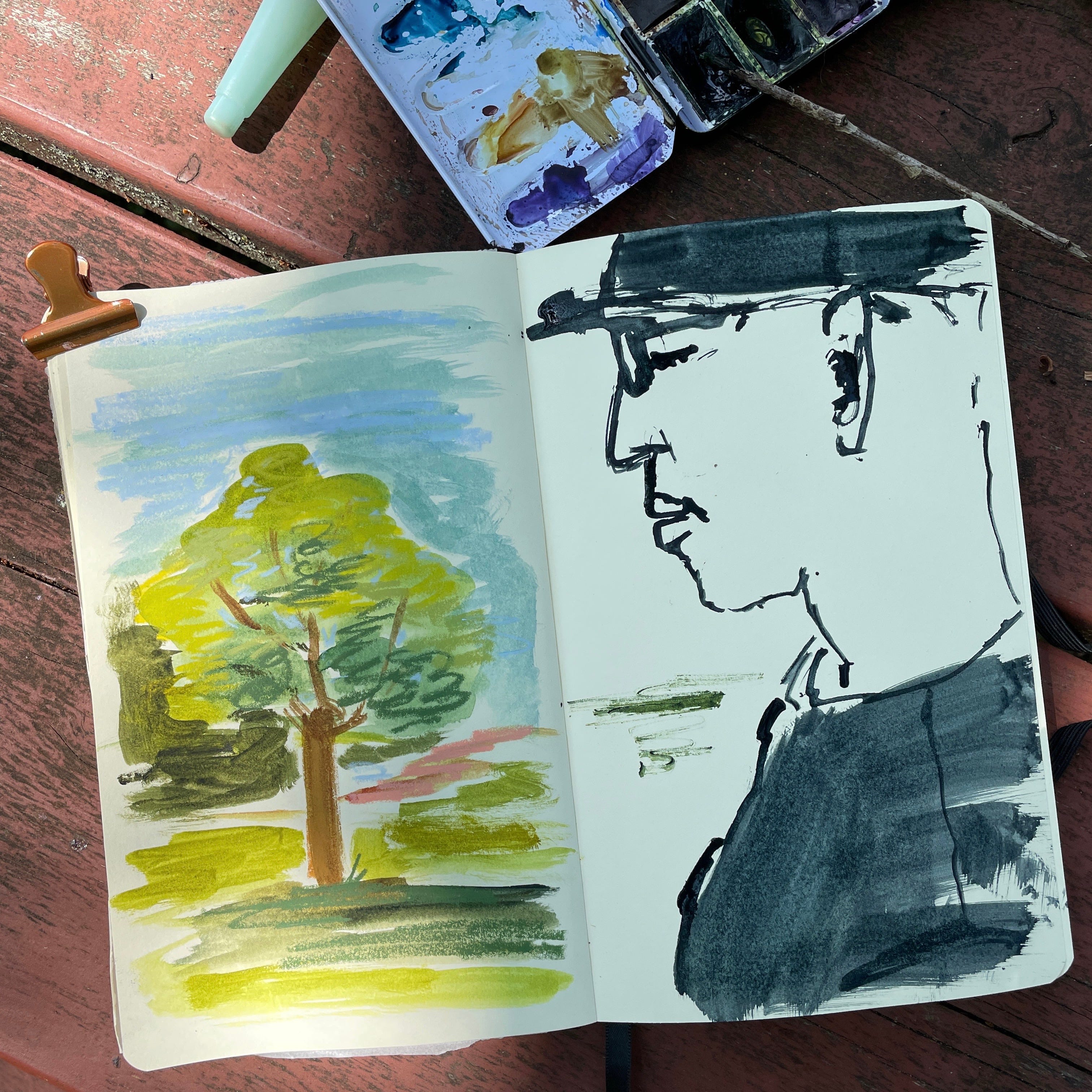And then I used watercolour as my base for this tree. I only had a water brush with me, which was very quickly running out of water. The portrait is of Ray with I drew with watercolour using a twig that was sitting on the table!