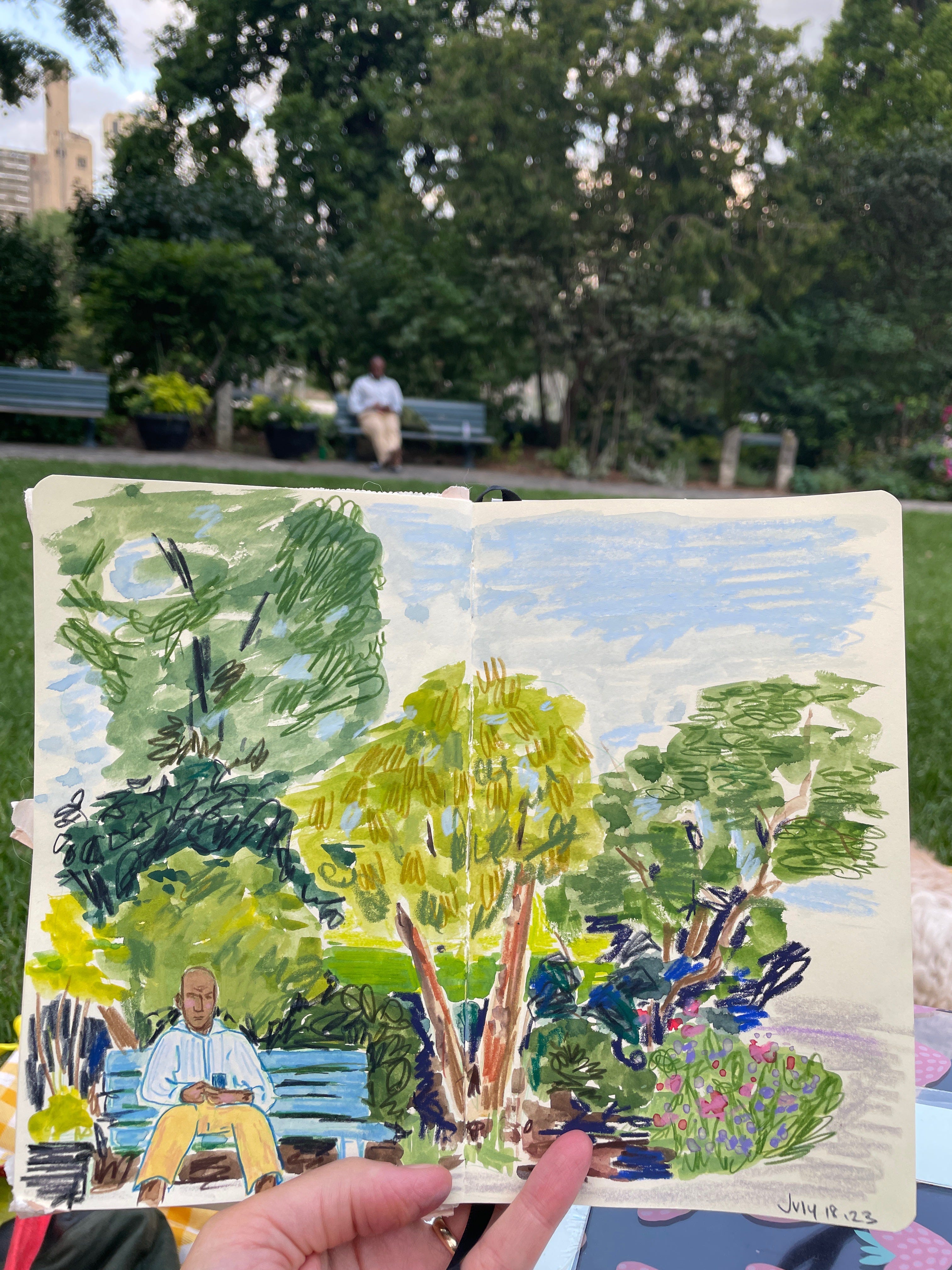 We decided to keep it simple and headed to the park across the street, to a spot we haven’t sat at yet. There happened to be a gentleman sitting in the bench right in my view, so it was decided for me that I’d be adding him into my painting. He was very accommodating and sat relatively still the entire time. No idea if he knew I was drawing him, but for sure he knew I was drawing because all the supplies were everywhere. If he did he didn’t seem to mind.