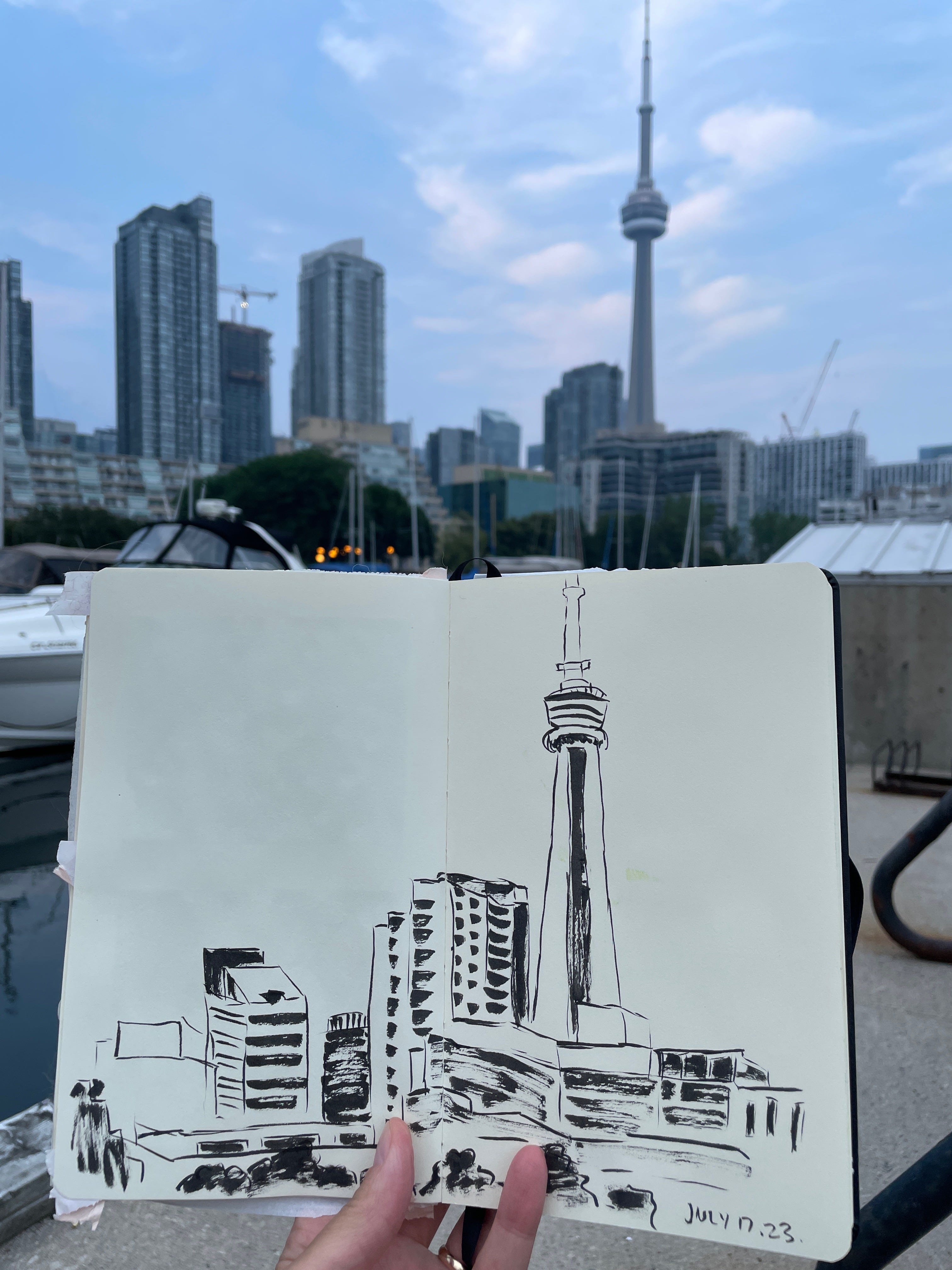 After dinner we packed up and headed over to the marina-side of the Music Garden. I wasn’t in the mood to pull out all the things, so I decided to go with an inky sketch of the city view, something I rarely do.