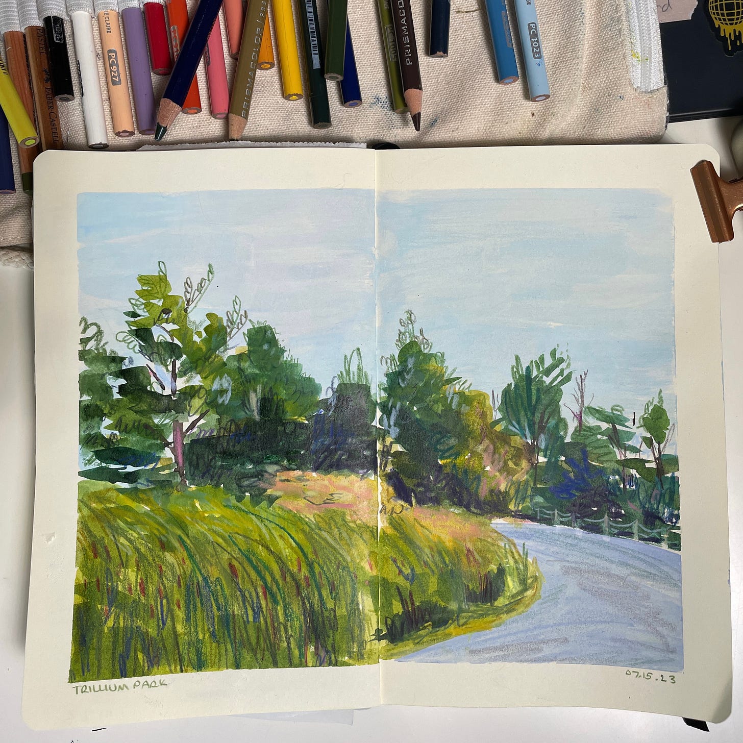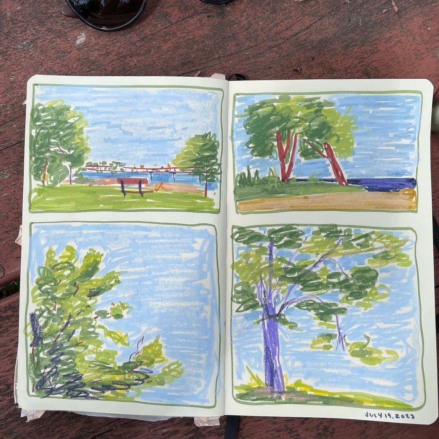 Then we found a picnic bench to chill at for a couple of bevvies and some sketchbook time. I used my new Pitt markers as my base for these landscape doodles, which I wasn’t really loving on their own, but then added wax pastels on top and liked them much better.