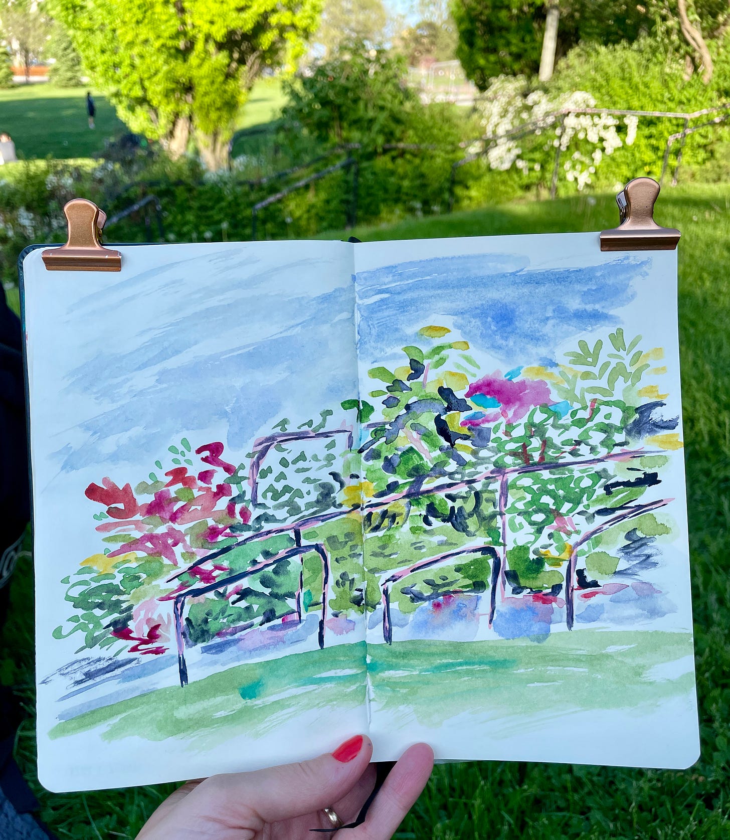 Another quick one, where I started with a woman wearing a cute sun hat who immediately moved as soon as I got the hat painted. I’m telling you, intending to draw/paint someone is a super power in getting to move. (I’m not sure I want such power!) Anyway, I just added more foliage where her face would have been LOL.