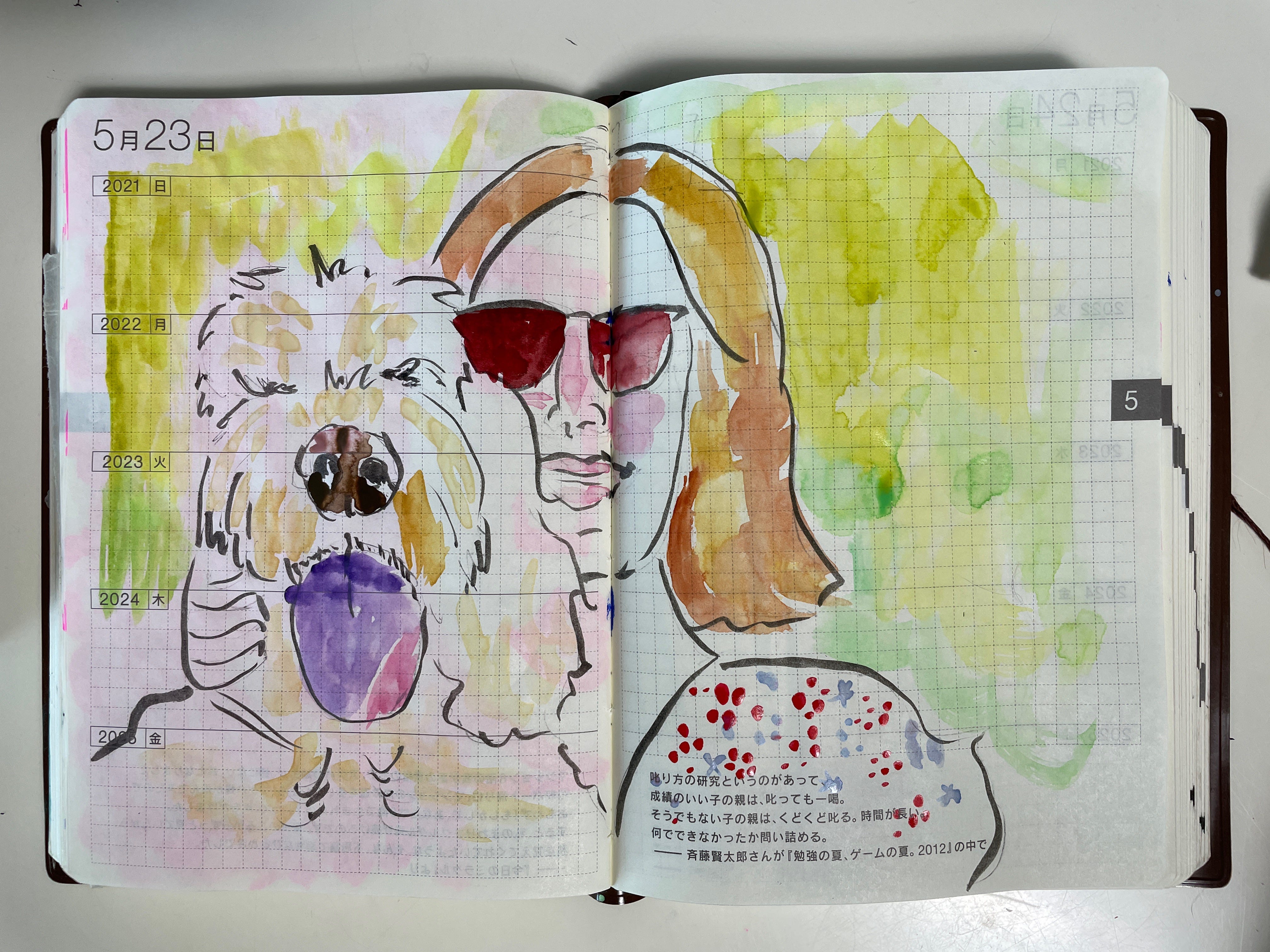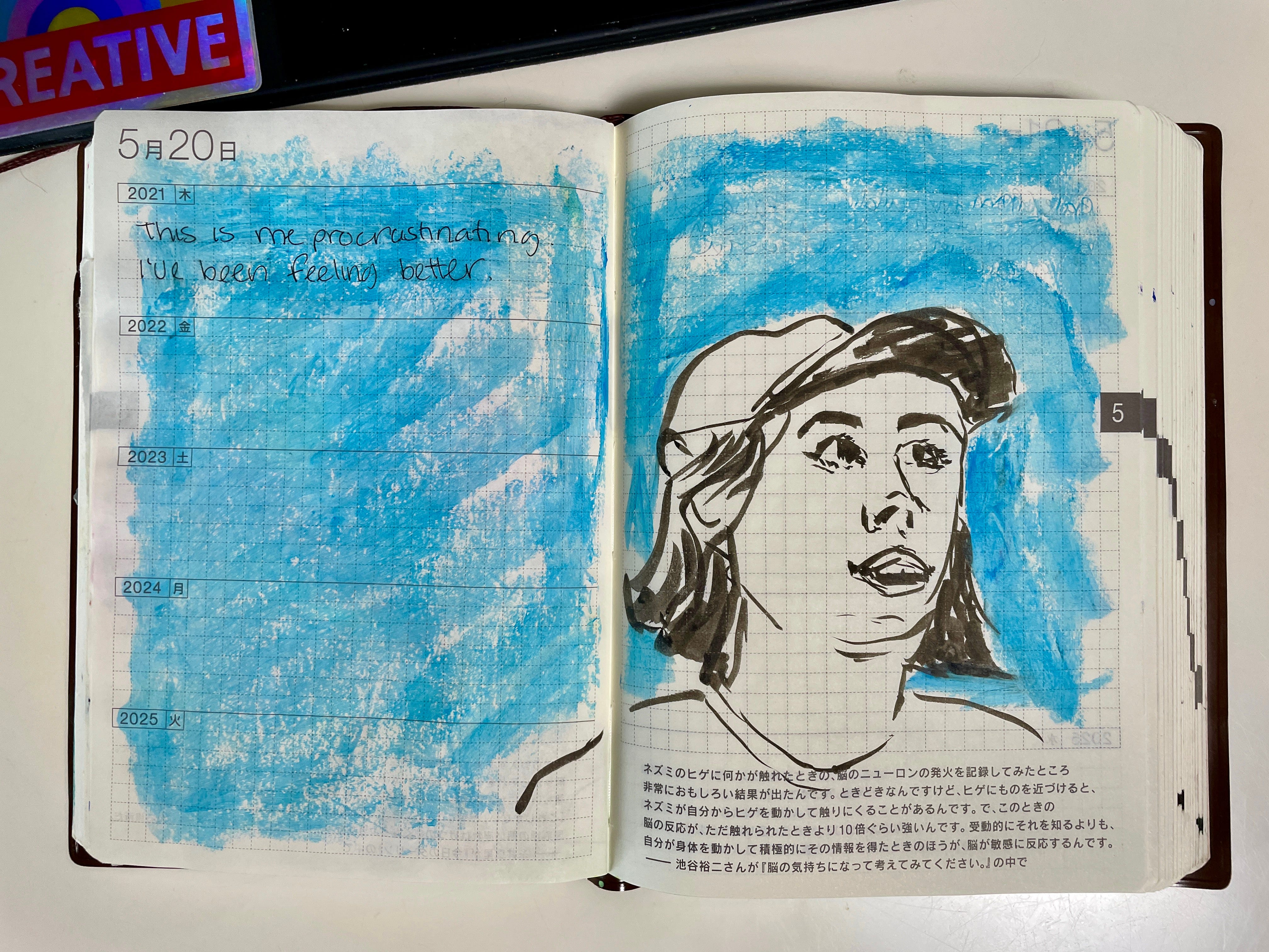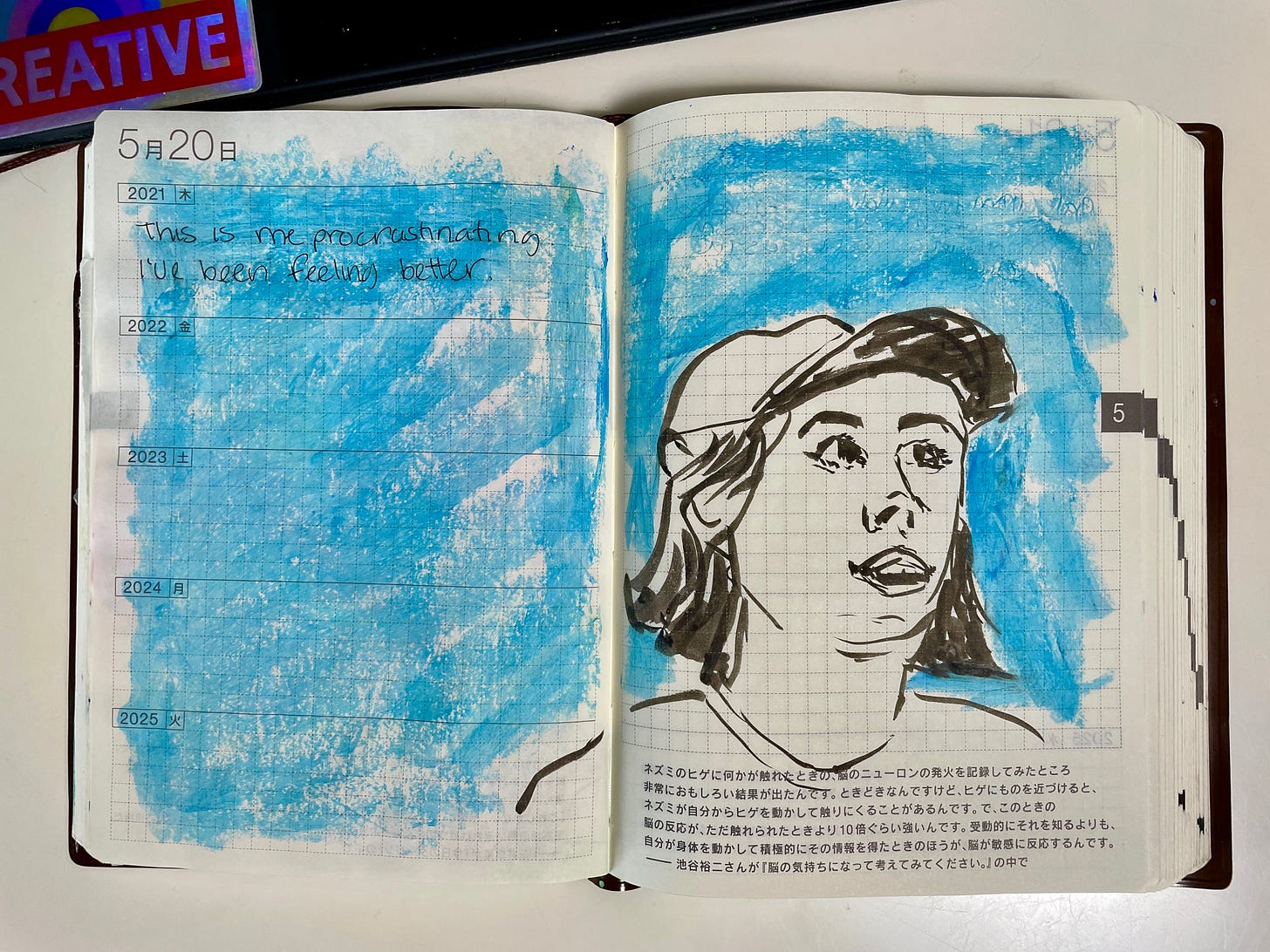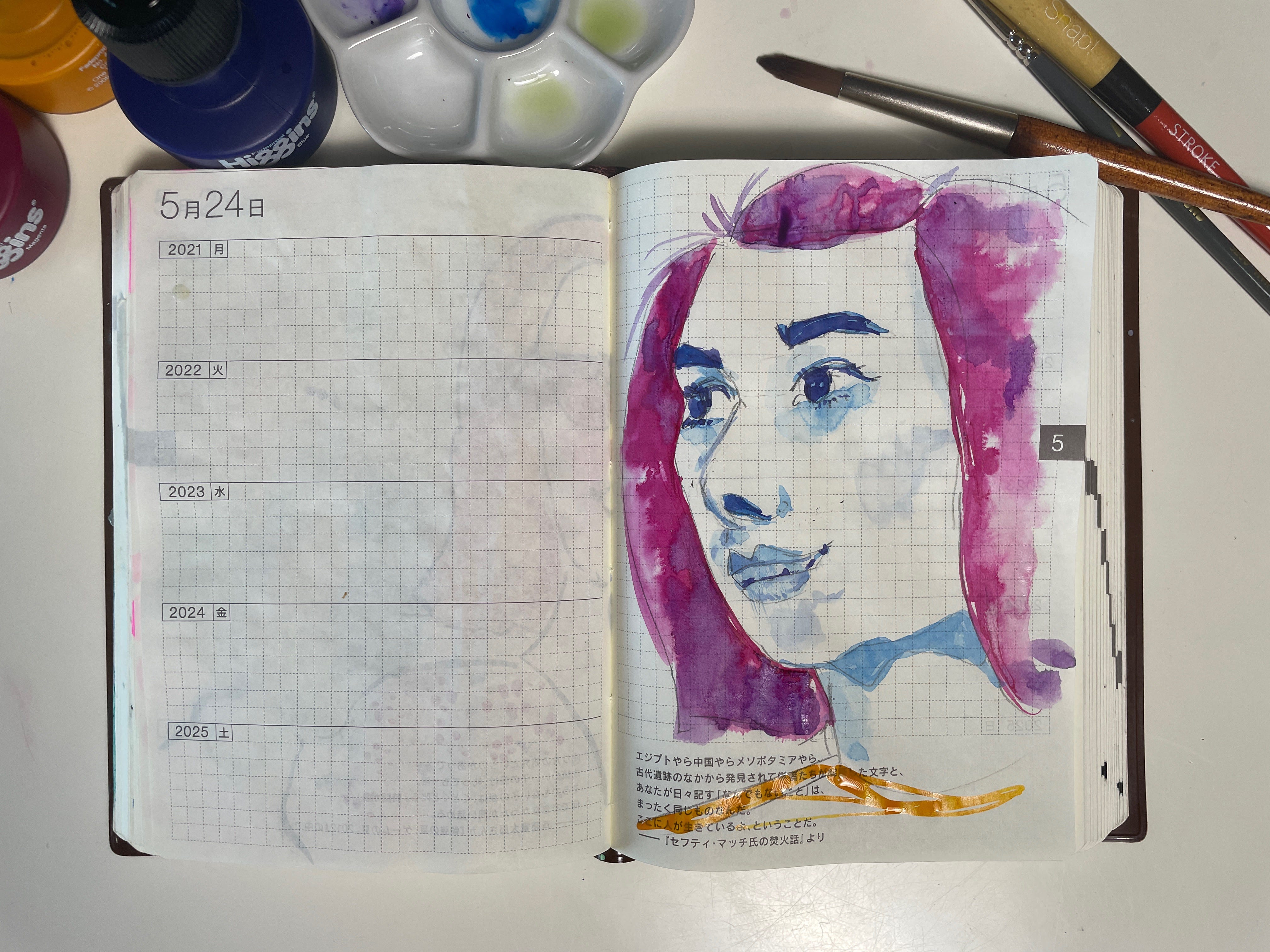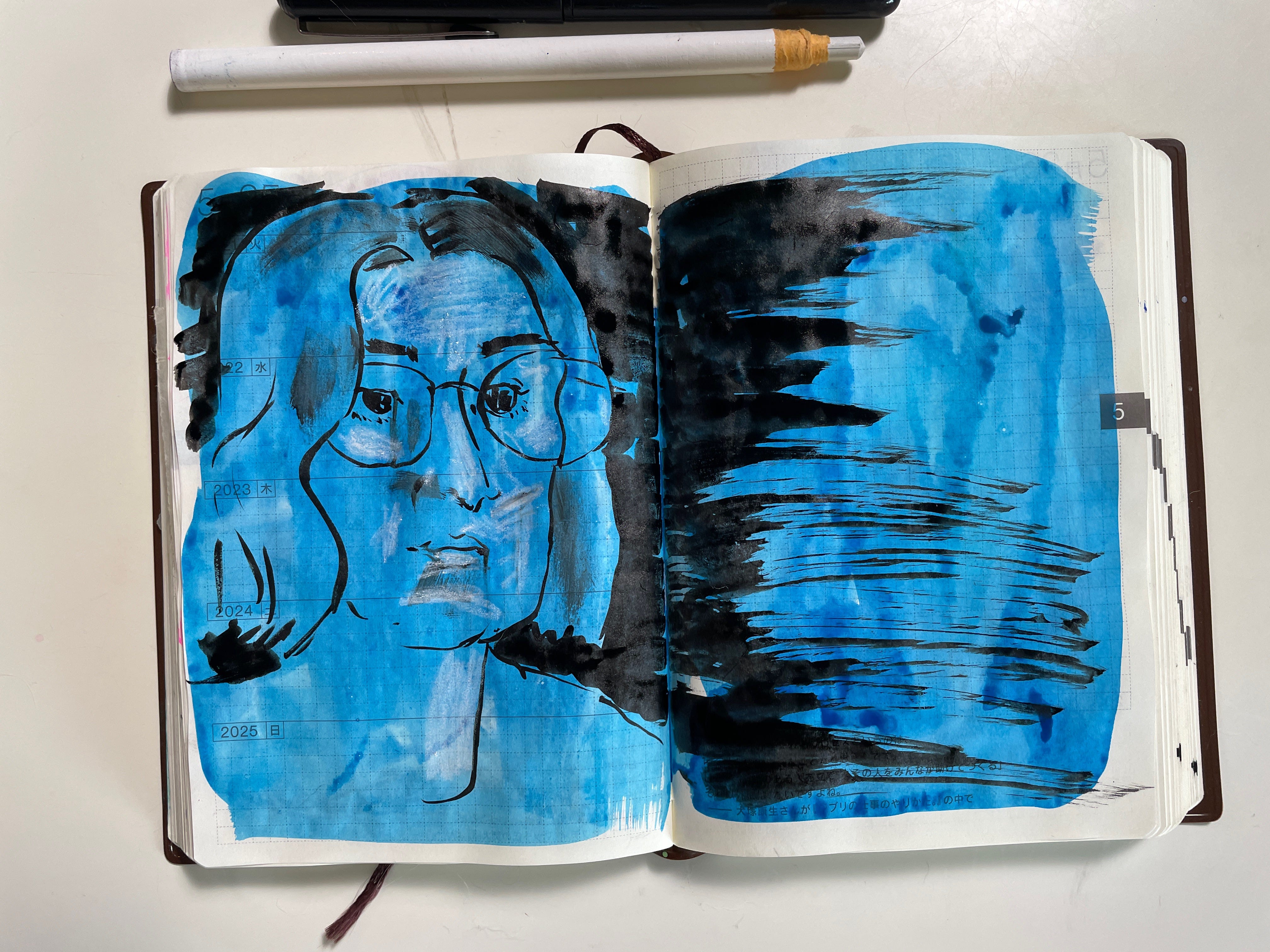 When I was refilling the cartridge for my brush pen yesterday I used today’s self portrait spread to wipe my fingers on and catch the mess. LOL a gift to my future self!