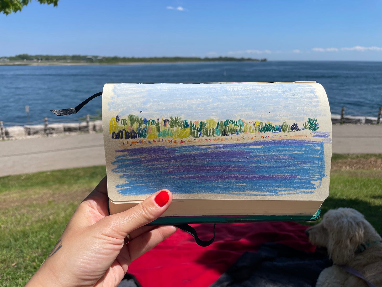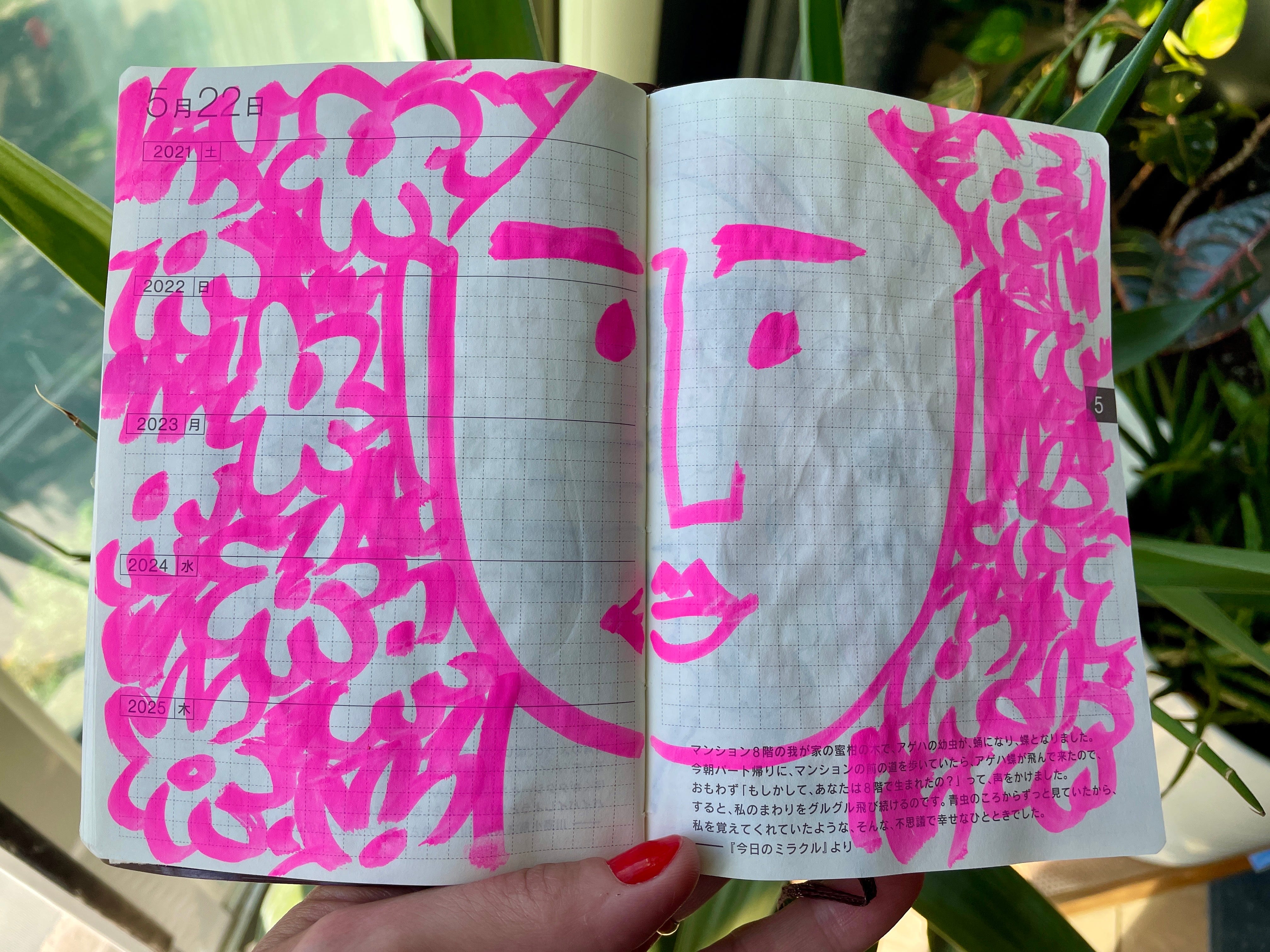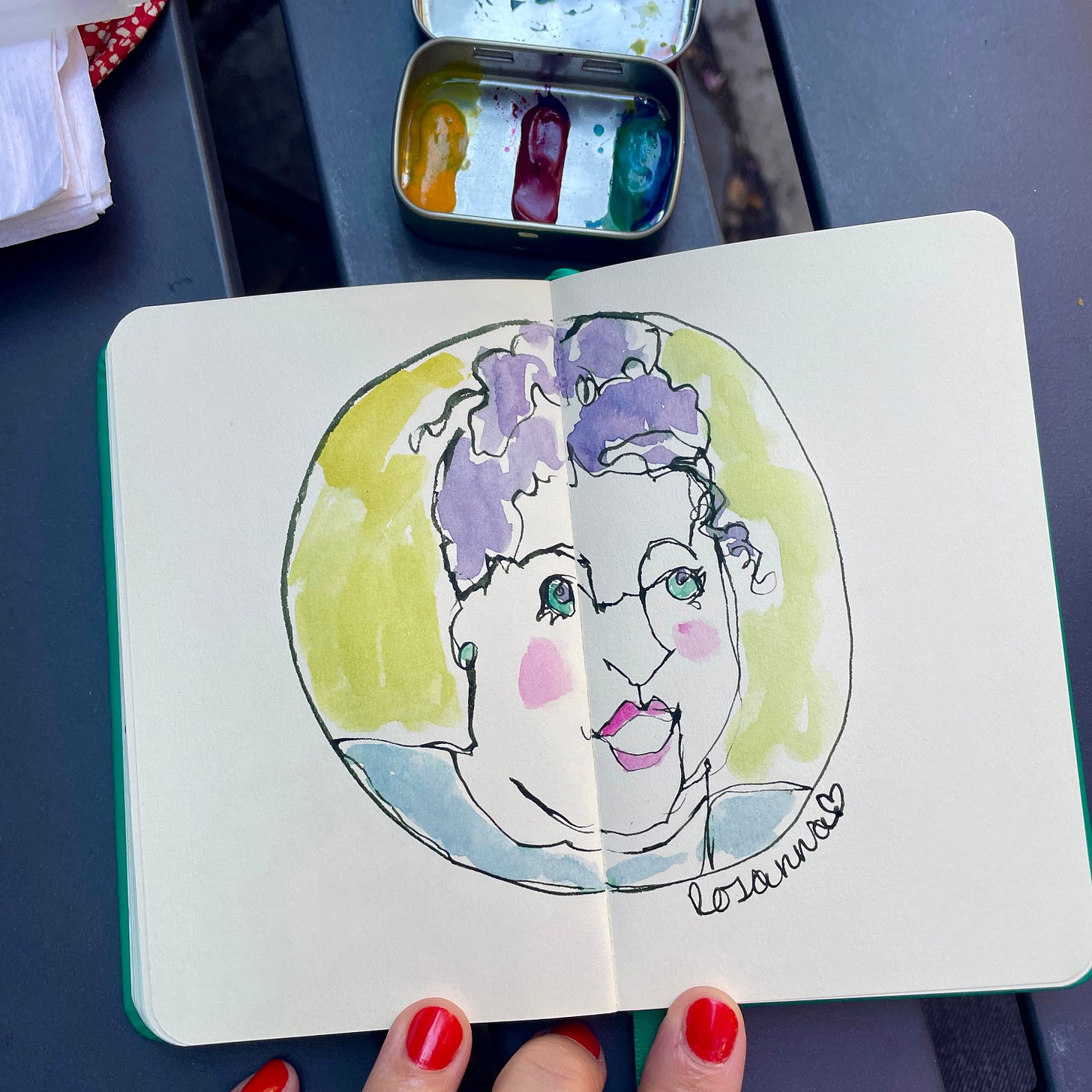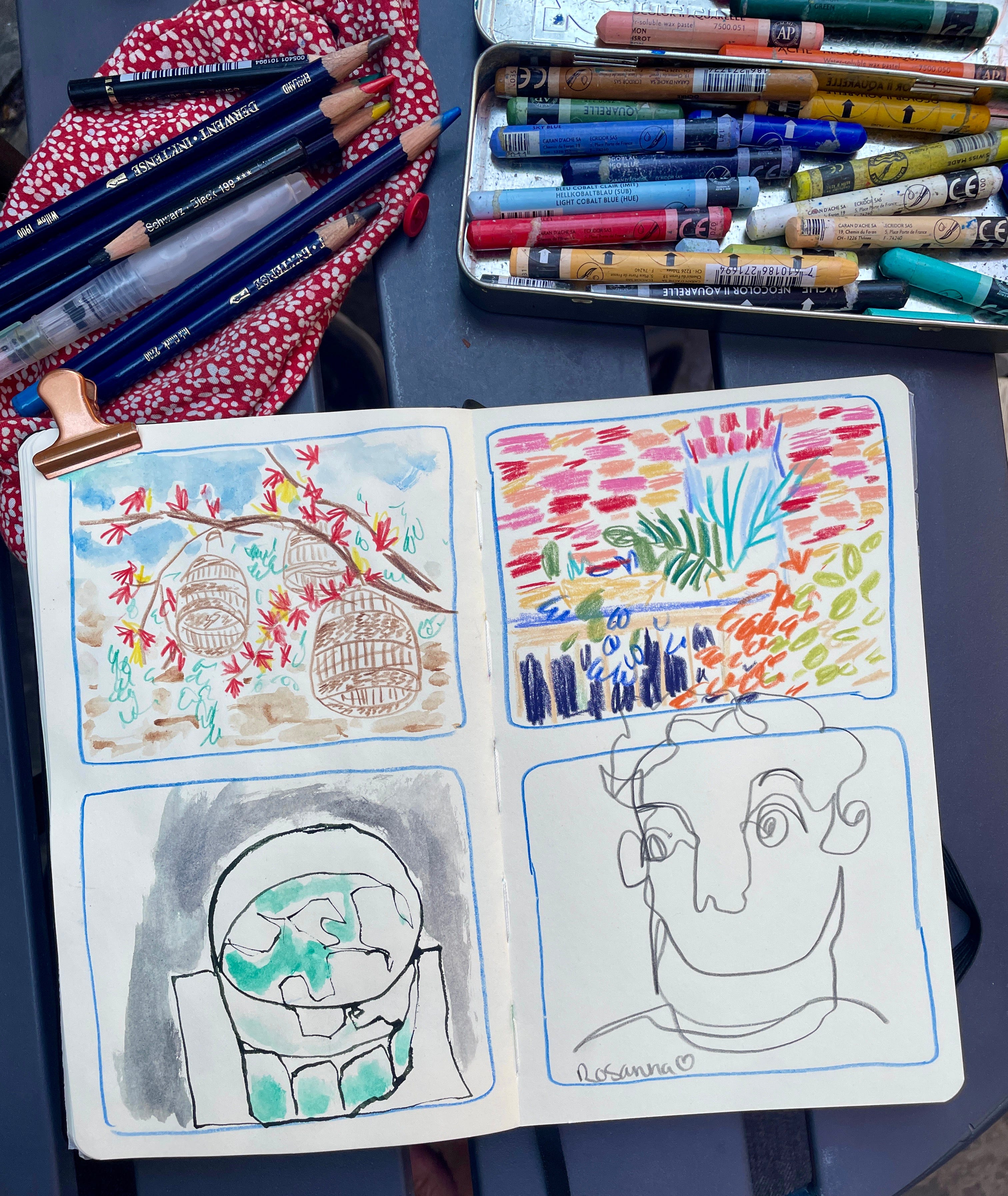 I didn’t take any photos of the patio but hope my drawings will give you an idea of the vibe. The bottom right is Rosanna drawn in a single line blind contour at the same time she drew me - so fun!