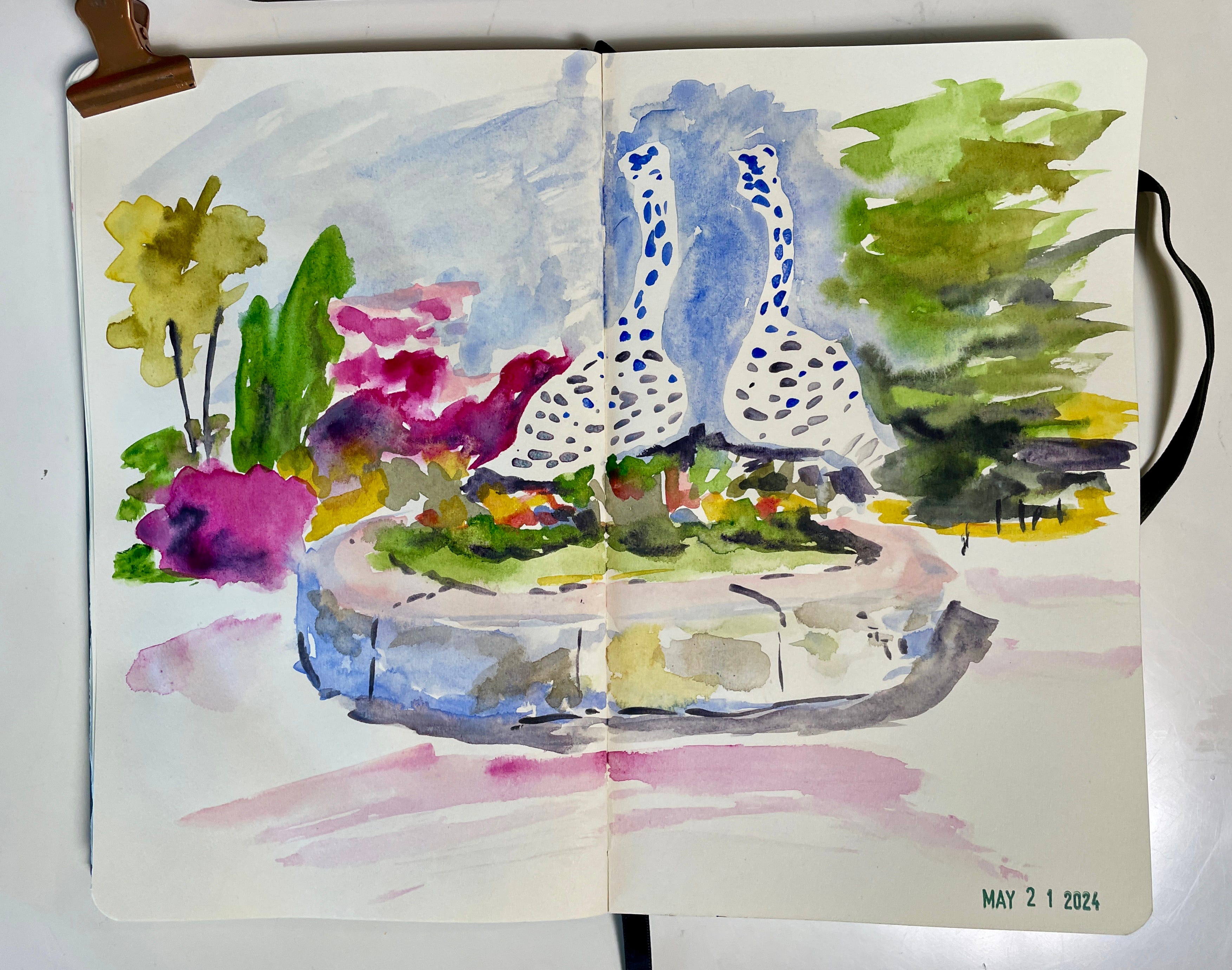 But first, I did this quick watercolour sketch of some geese topiaries from just down the street. They used to keep these filled with climbing plants, but I think it was last year they cut them all out and looks like they’ve decided to keep them empty now.