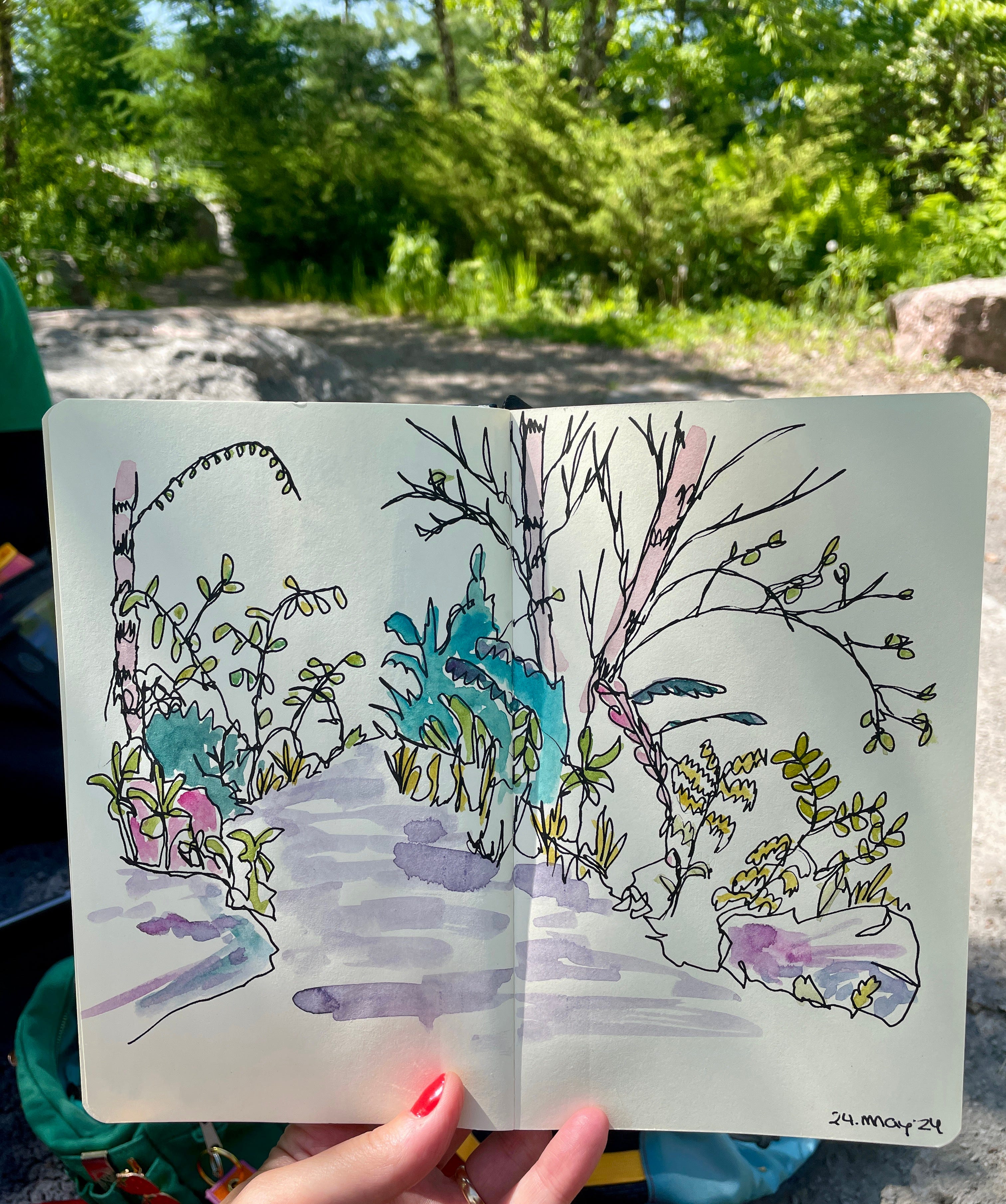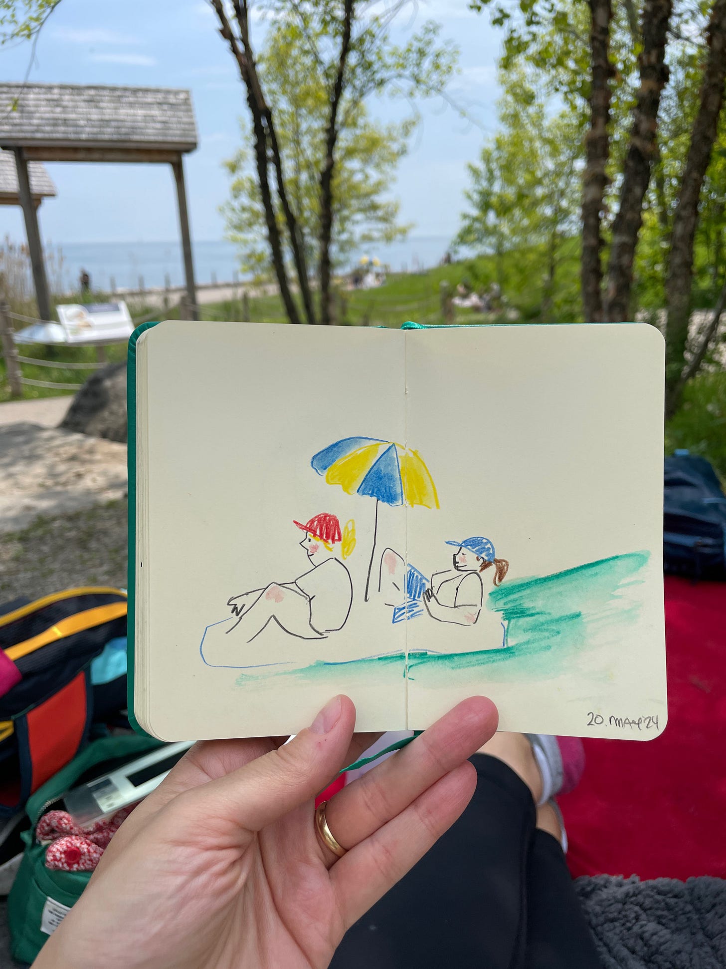 We started to get swarmed by midges so we gathered our things and went back to the little tucked away spot we sat at last time. I wasn’t going to do any more drawing but I was sitting facing the other direction and it was looking pretty cute so I slowly did a single line drawing, adding light touches of watercolour after. I kinda love it!