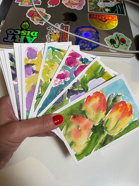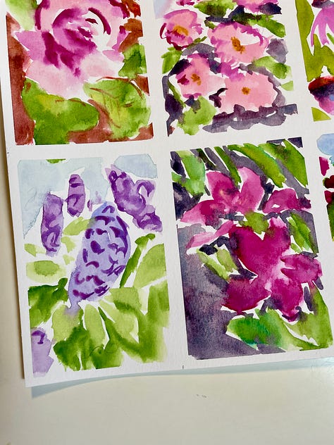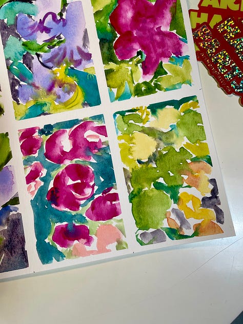 I basically threw paint at the paper and am really pleased with how these all came out! I don’t think I could paint better flowers if I intentionally sat down to paint flowers. I need the slight panic™️ of ART HANG PARTY!