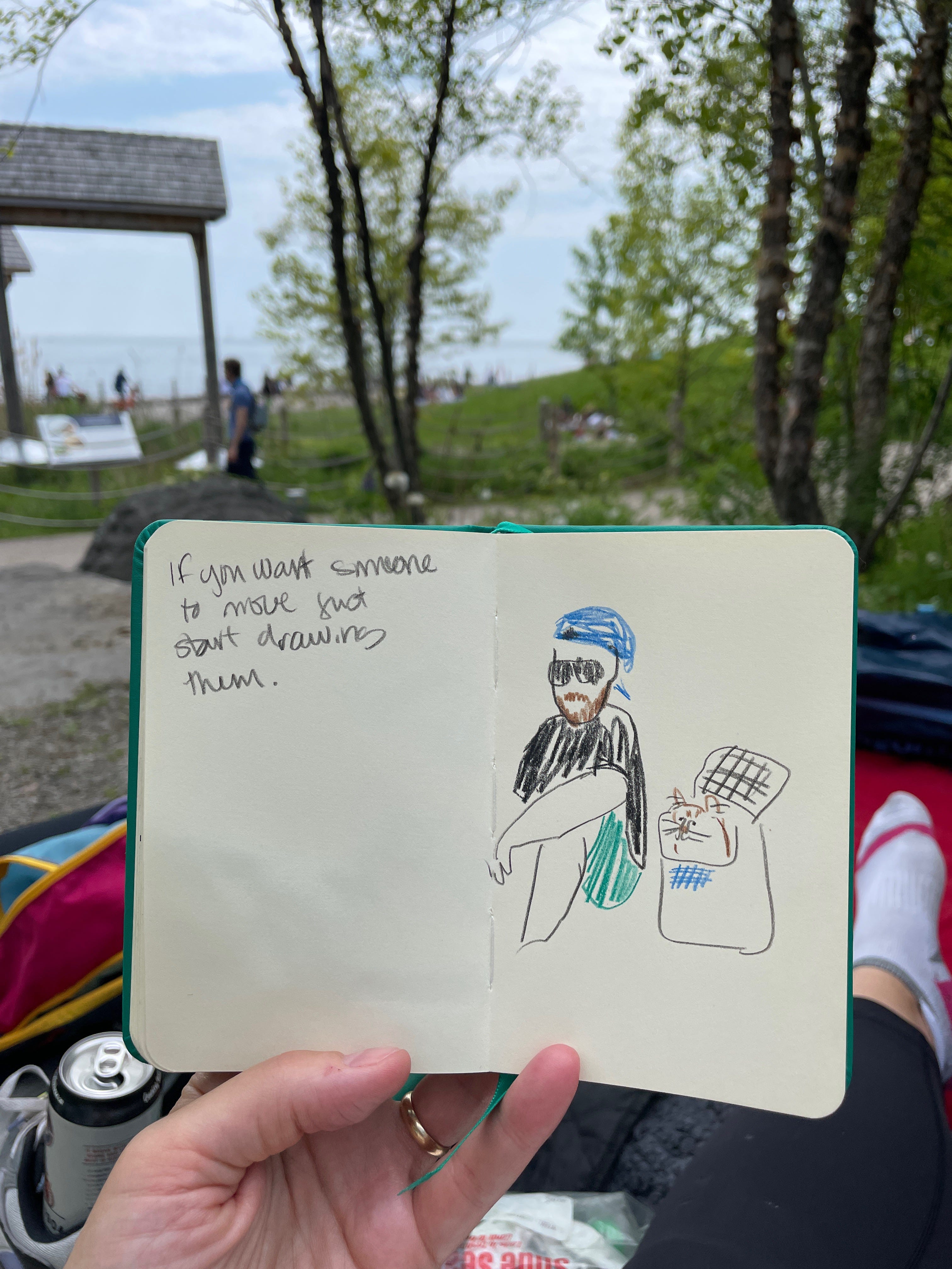 Then we went to sit in the park because why not! I was already pretty creatively spent so I only took out a Inktense pencils and my little “people from life” sketchbook and caught Simon just straight-up chillin’