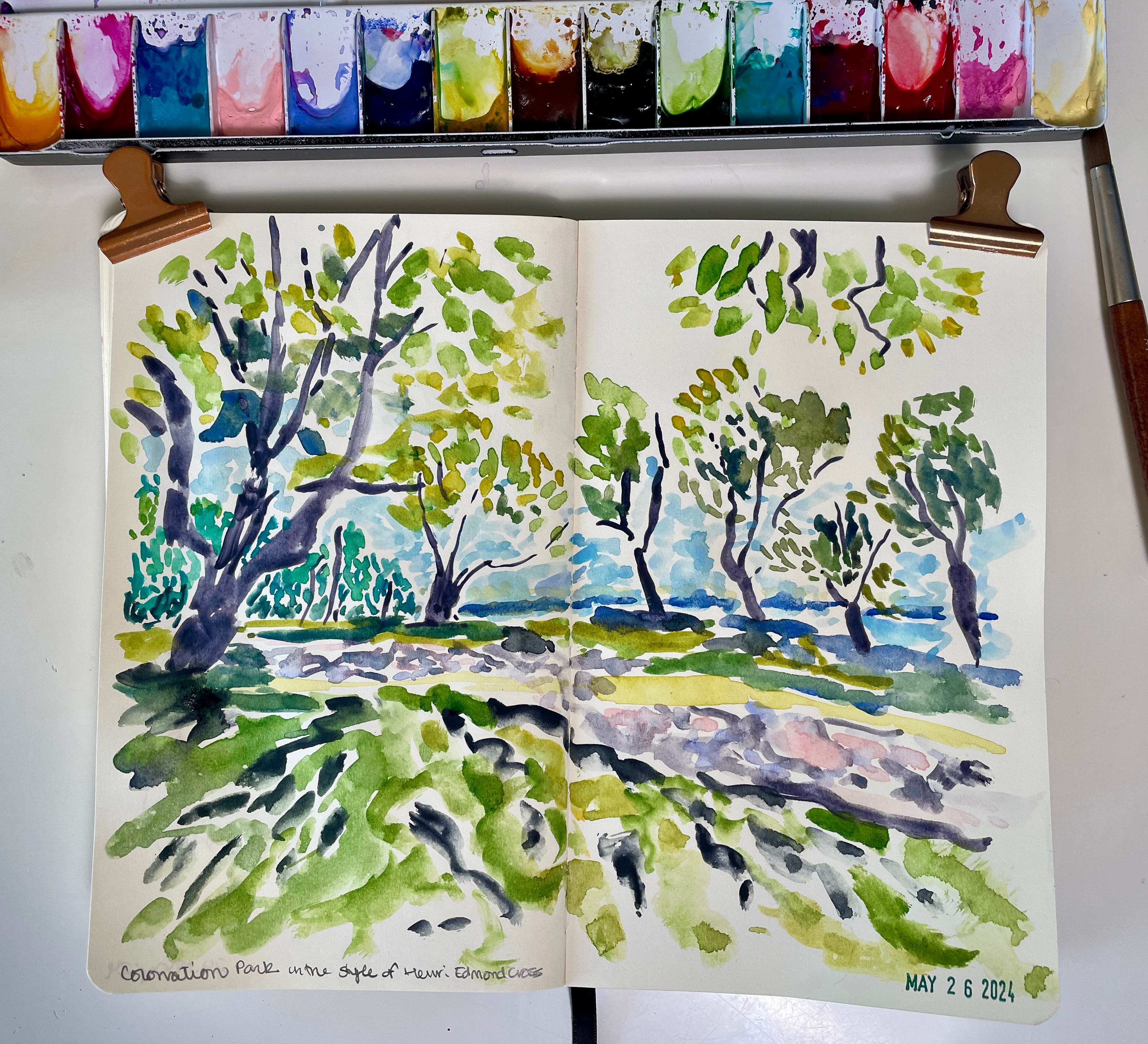 So, I had his photos open on one side of my ipad, a photo I snapped of Coronation Park during my morning run on the other, and with my watercolours in front of me I started to “draw with watercolour”.