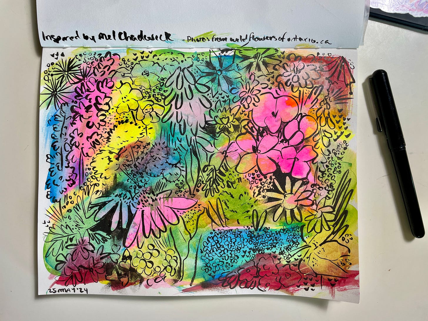 We all know who Melanie Chadwick is, yes? Well after watching her latest YouTube video drawing wildflowers over a colourful wash of ink I was so inspired to give it a try!